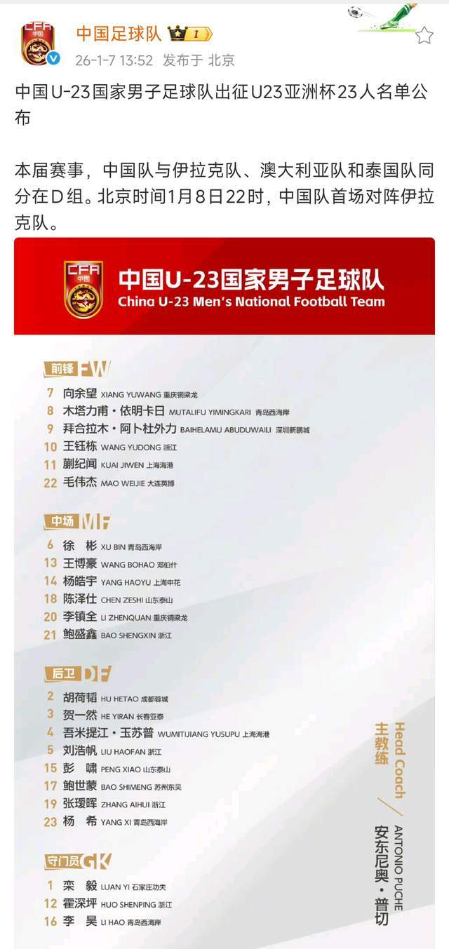 今天下午1点多,中国足球队正式官宣了本次U23亚洲杯的23人大名单,我们先来看一下组成人选: